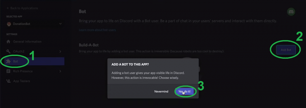 Then, you want to select the “Bot” option, click on the “Add Bot” button, and confirm with a click on “Yes, do it!”: