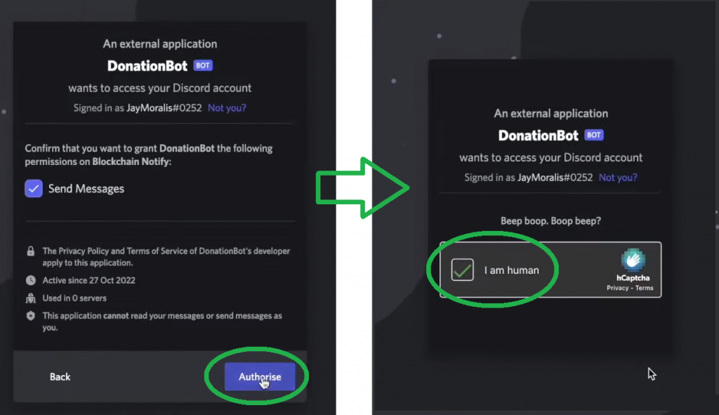 To finalize this step of building a Discord bot for crypto, you’ll also need to click on the “Authorize” button and confirm that you are human: