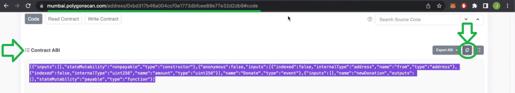 Next, return to PolygonScan to copy the smart contract’s ABI: