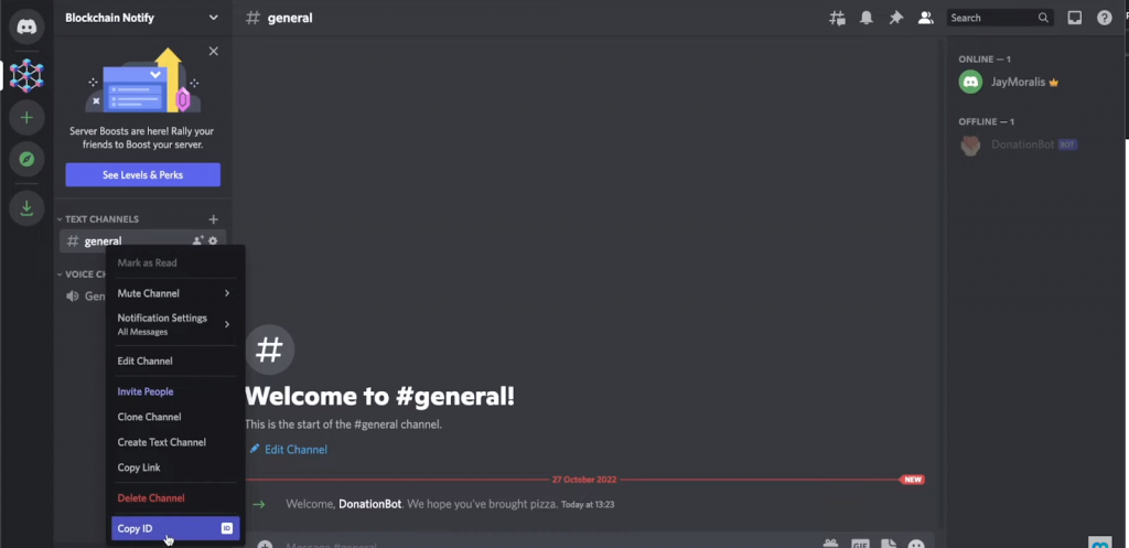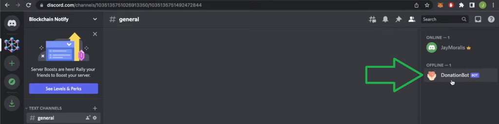 Now, you can close that tab and visit your Discord. If you’ve followed our instructions, you should now have the “DonationBot” bot in your “Blockchain Notify” Discord server: