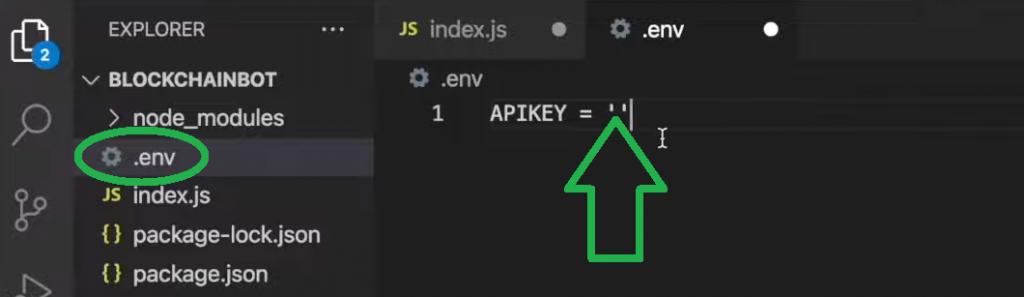 Next, return to VSC, create a new file (“.env”), and paste your Web3 key next to “APIKEY”: