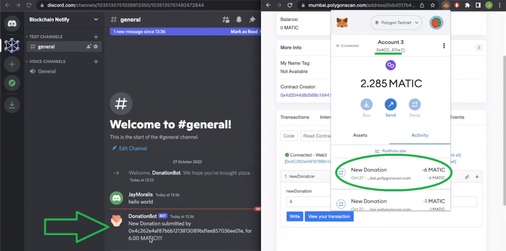 Looking at the above screenshot, you can see our crypto monitor Discord bot (“DonationBot”) in the right sidebar. Next, we use PolygonScan to interact with our example “donationExample” smart contract. Obviously, this is the smart contract that our example blockchain Discord bot listens to.