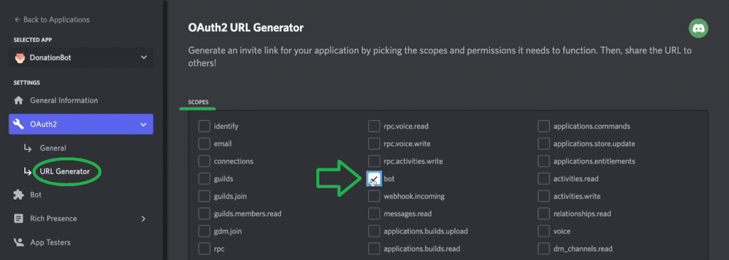 Next, as indicated in the image above, check the “bot” scope. Then, scroll down and check the “Send Message” permission: