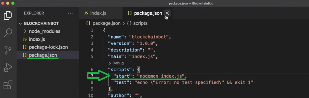 With the dependencies in place, open your “package.json” file and add the “start” script for “nodemon“:
