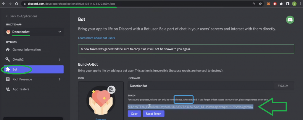 Looking at the bottom line of the code above, you can see that you need to add the “PASS” variable to your “.env” file. To get this variable, return to your “DonationBot” application (the “Bot” option) and click on the “Reset Token” button. Then copy the token: