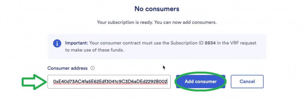 With the deployed contract address copied, return to your Chainlink VRF subscription page and add a new consumer: