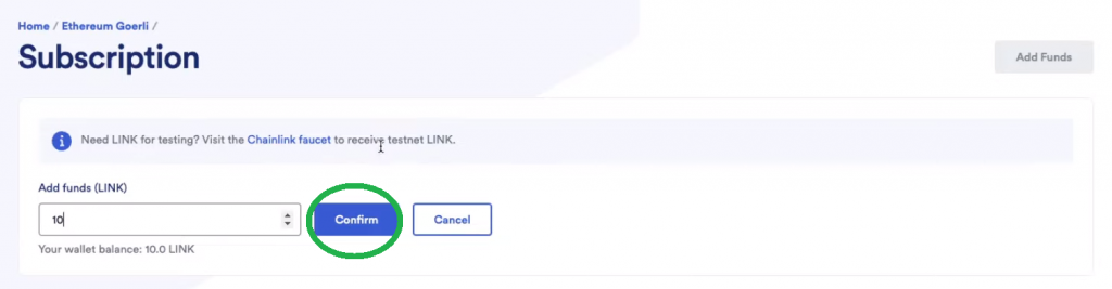 Once your wallet is connected, click on “Create Subscription” and confirm the transaction with your MetaMask wallet. Then, you need to make sure your account has enough funds. Since you are on the testnet, you can use the Chainlink testnet faucet to get testnet LINK. Just connect your wallet and request ten testnet LINK tokens: