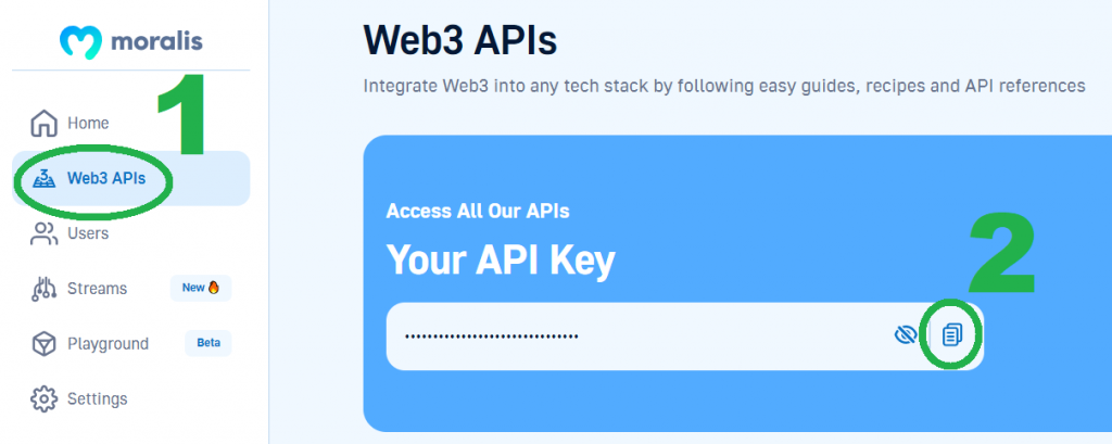 So, if you want to create your unique NFTs, you need to have your images inside the “img” folder and tweak the descriptions in the “ipfs-upload.py” script accordingly. Furthermore, both of these scripts use Moralis’ “evm_api.ipfs.upload_folder” method. As such, make sure to get your Web3 API key and store it inside a “.env” file under “MORALIS_API_KEY“. You can get your API key from the Moralis admin area in these two steps: