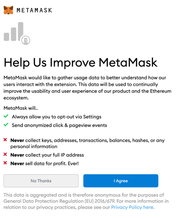 If either alternative is chosen, MetaMask will provide the user with an option to help improve MetaMask. It is up to the user if they are willing to participate, and it is possible to deny this request. If agreed upon, this enables MetaMask to collect data on how the user interacts with the extension. The reason for this is to allow the platform to develop and improve the user experience.