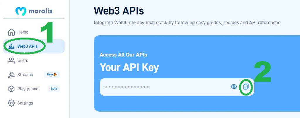 Once the above modules are installed, our virtual environment is ready to be used. As such, we can proceed with setting up the environment variables. This is where we’ll store the Moralis Web3 API key, which is the key to accessing the power of Moralis’ Solana Python API. So, in case you haven’t created your Moralis account yet, make sure to do so now. Then, you’ll be able to copy your Web3 API key from your admin area in two clicks: